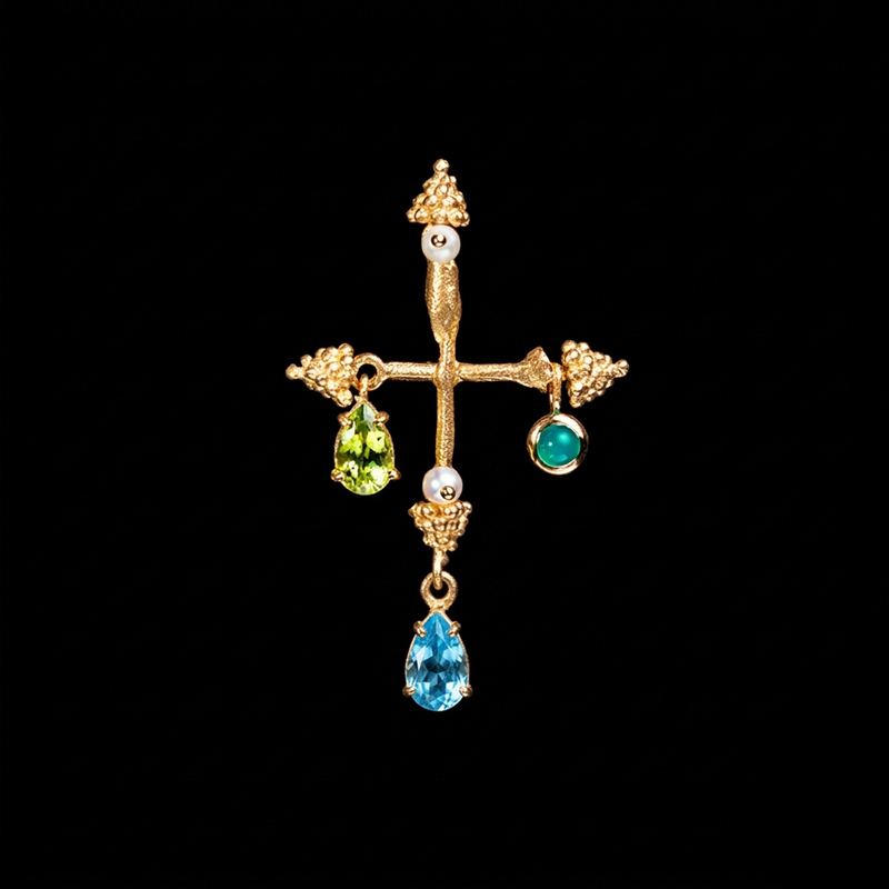 მახასიათებლებიმეტალი ვერცხლი 925 | 60.77 გრ ქვა ციტრინი | 1 ც | 1,33 გრ.| ზურმუხტი | 11 ც | 5,04 კტ. | ძოწი | 2 ც | 0,12 კტ. | კორუნდი | 2 ც | 0,19 გრ.| დამატებითი მასალები მოოქროვილი (24K)